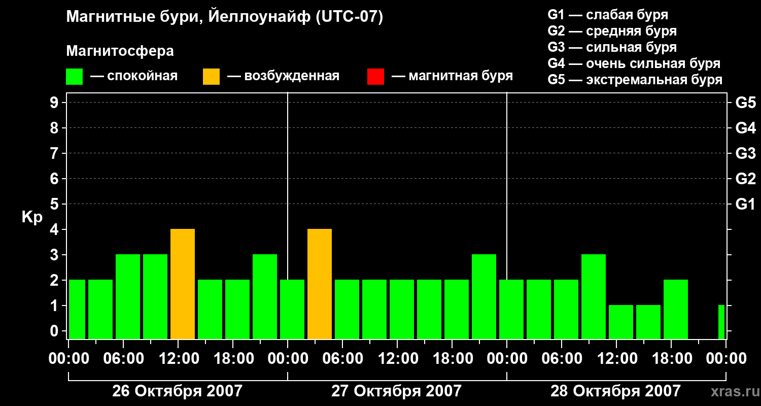 Изменения геомагнитного индекса Kp с 26 по 28 октября 2007 года для средних широт