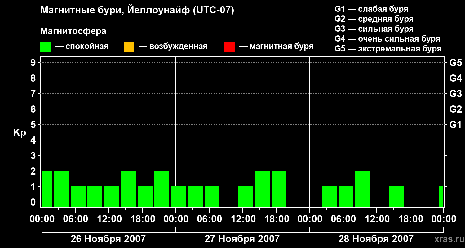 Изменения геомагнитного индекса Kp с 26 по 28 ноября 2007 года для средних широт
