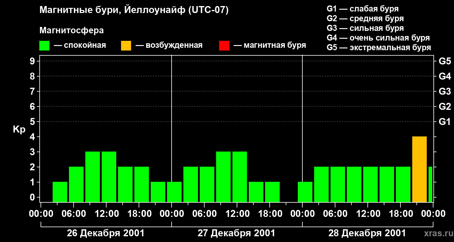 Изменения геомагнитного индекса Kp с 26 по 28 декабря 2001 года для средних широт