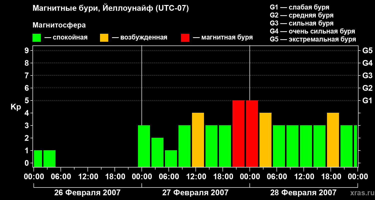 Изменения геомагнитного индекса Kp с 26 по 28 февраля 2007 года для средних широт