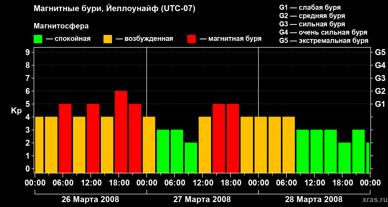 Изменения геомагнитного индекса Kp с 26 по 28 марта 2008 года для средних широт