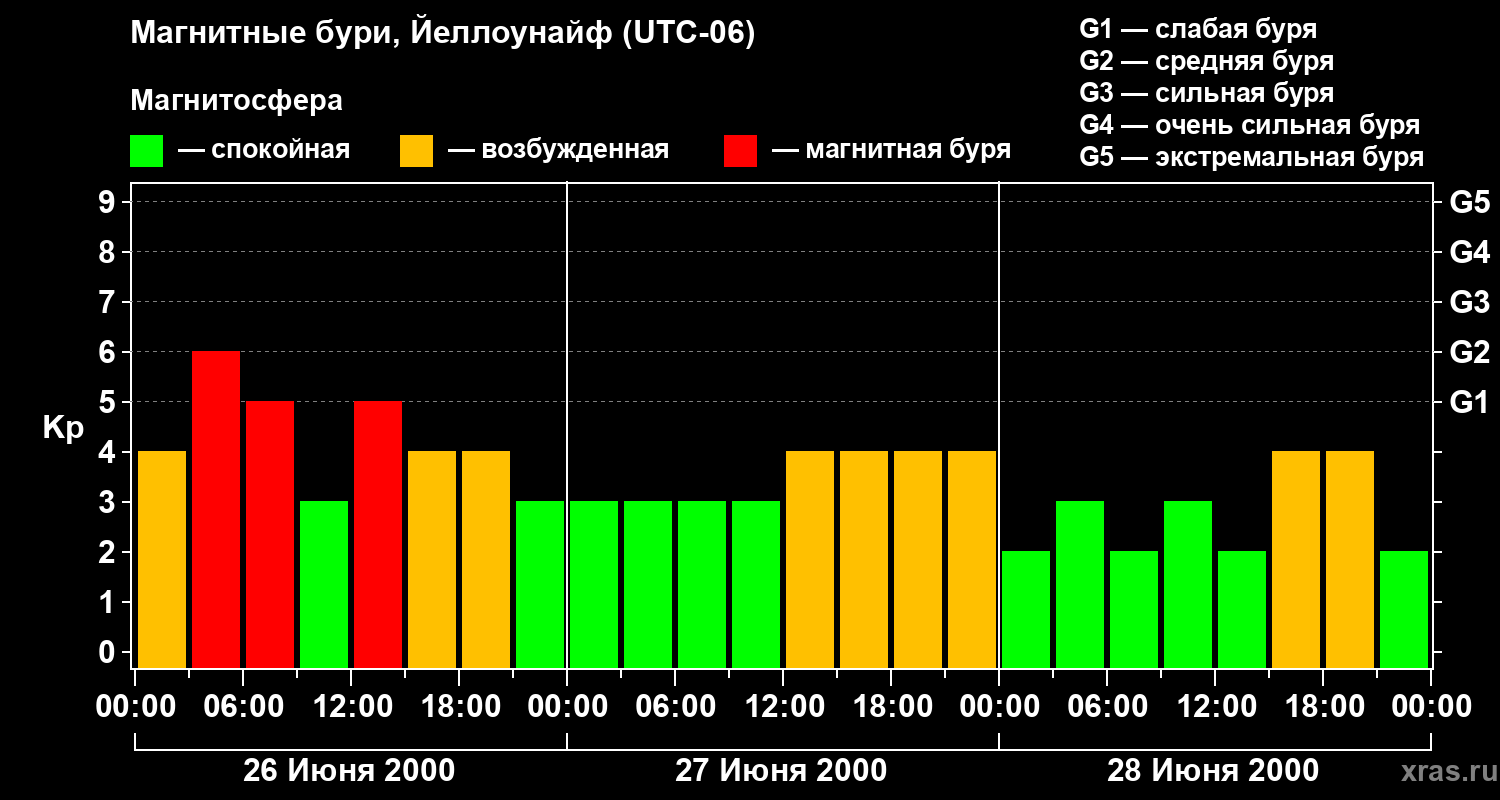 Изменения геомагнитного индекса Kp с 26 по 28 июня 2000 года для средних широт