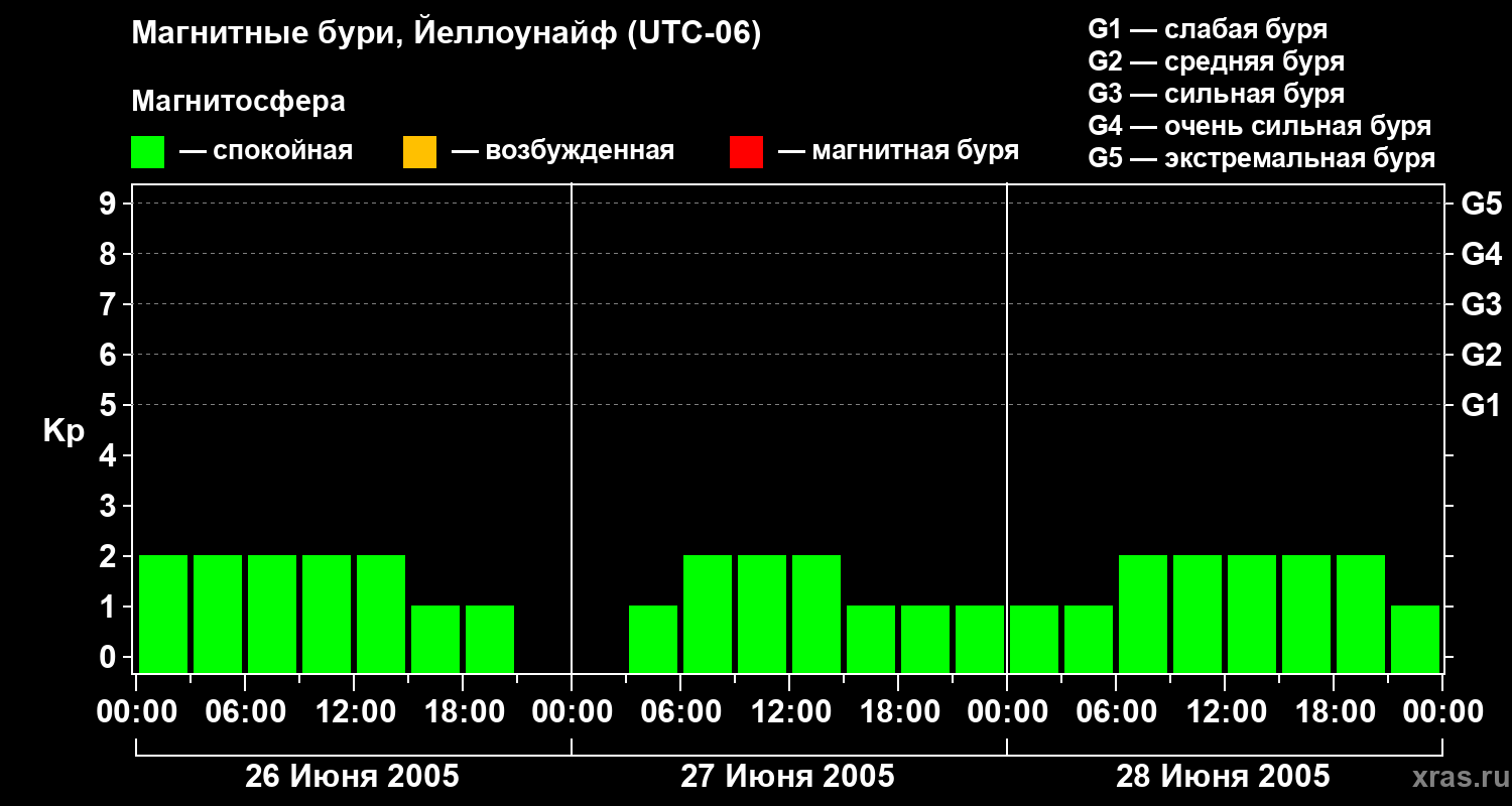 Изменения геомагнитного индекса Kp с 26 по 28 июня 2005 года для средних широт