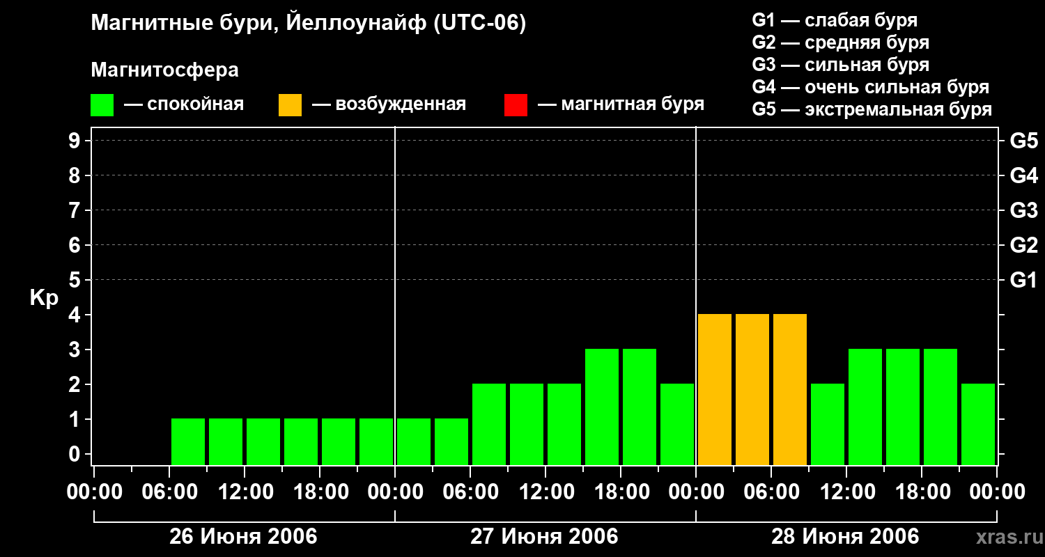 Изменения геомагнитного индекса Kp с 26 по 28 июня 2006 года для средних широт