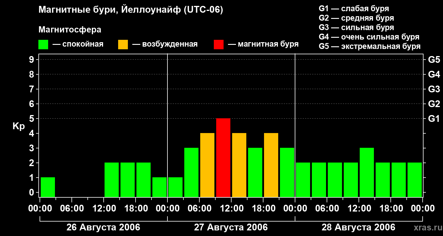 Изменения геомагнитного индекса Kp с 26 по 28 августа 2006 года для средних широт