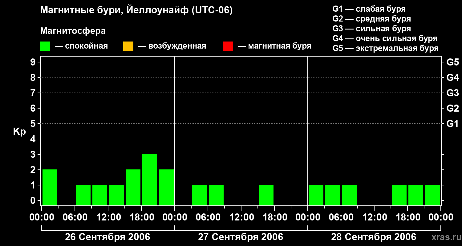 Изменения геомагнитного индекса Kp с 26 по 28 сентября 2006 года для средних широт