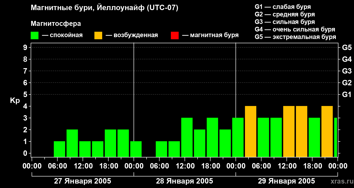 Изменения геомагнитного индекса Kp с 27 по 29 января 2005 года для средних широт