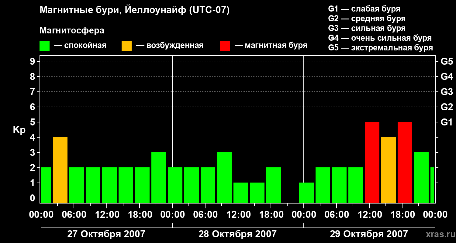 Изменения геомагнитного индекса Kp с 27 по 29 октября 2007 года для средних широт