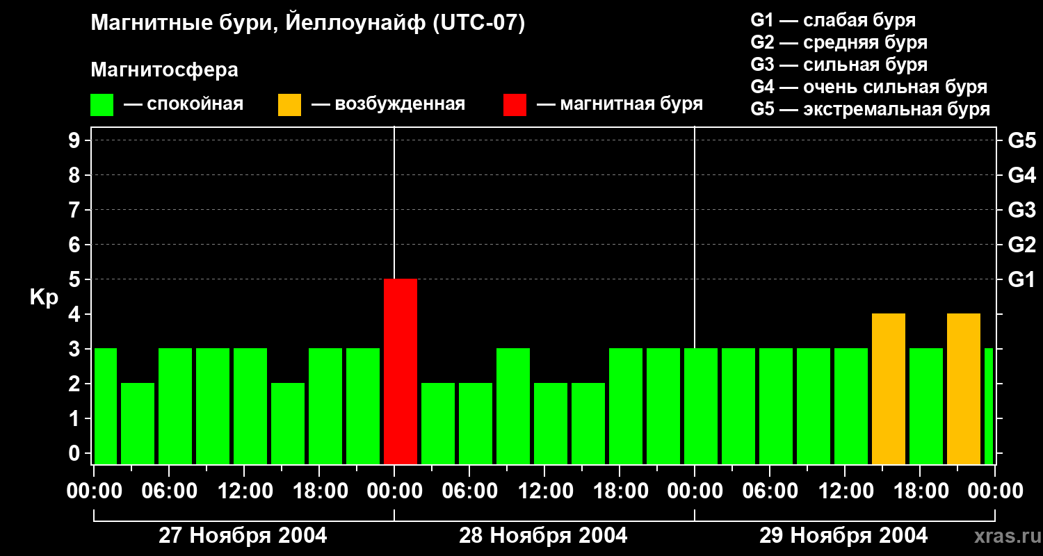 Изменения геомагнитного индекса Kp с 27 по 29 ноября 2004 года для средних широт