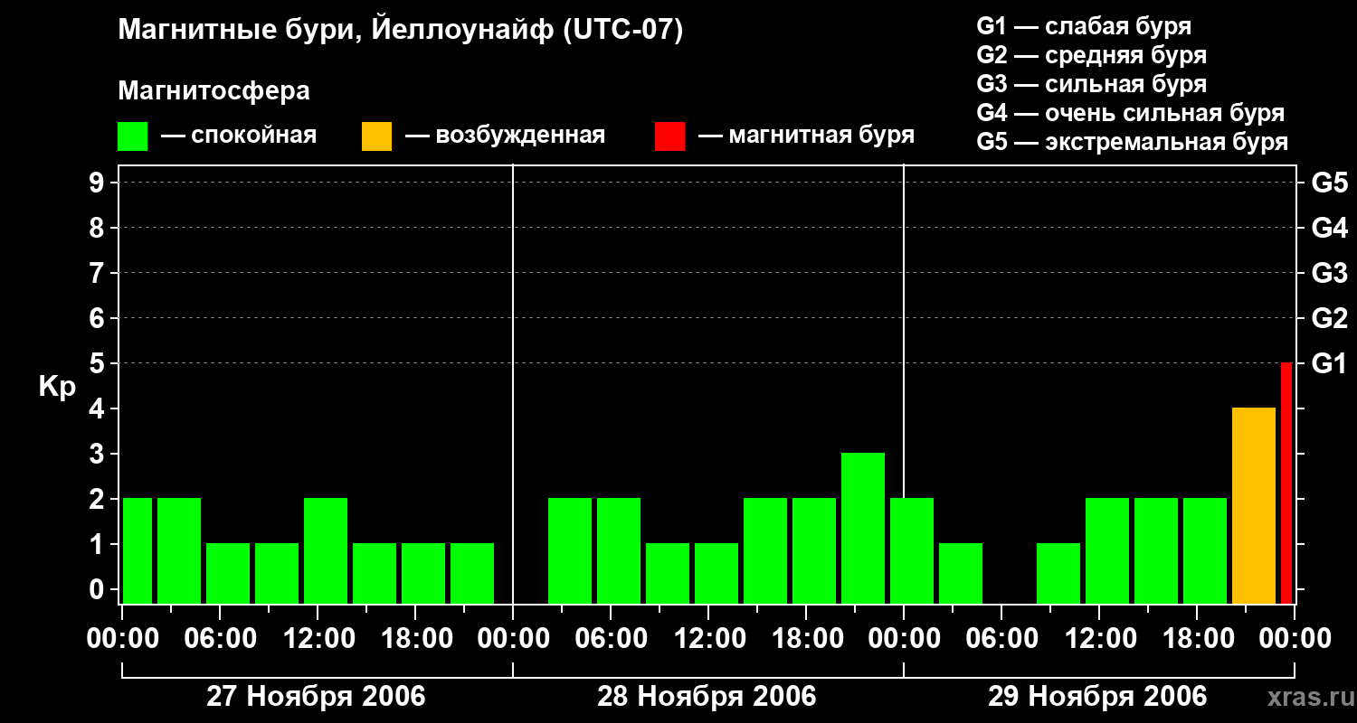 Изменения геомагнитного индекса Kp с 27 по 29 ноября 2006 года для средних широт