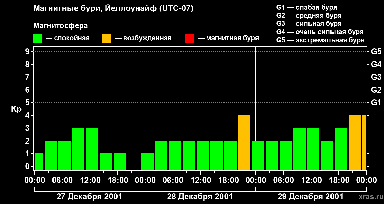 Изменения геомагнитного индекса Kp с 27 по 29 декабря 2001 года для средних широт
