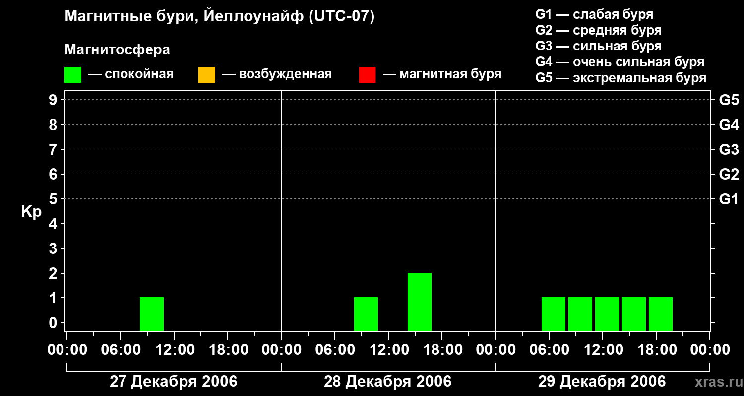 Изменения геомагнитного индекса Kp с 27 по 29 декабря 2006 года для средних широт