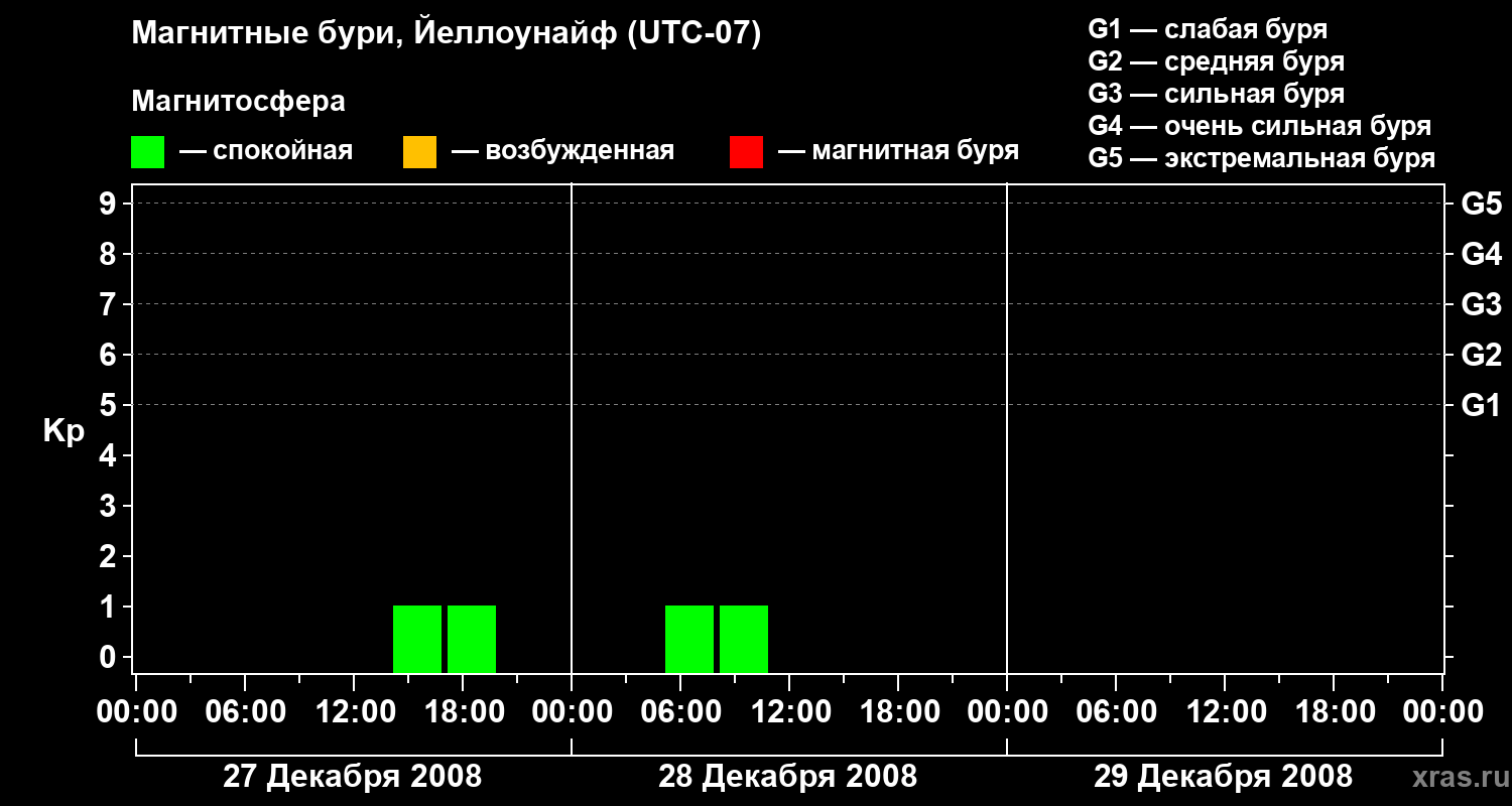 Изменения геомагнитного индекса Kp с 27 по 29 декабря 2008 года для средних широт
