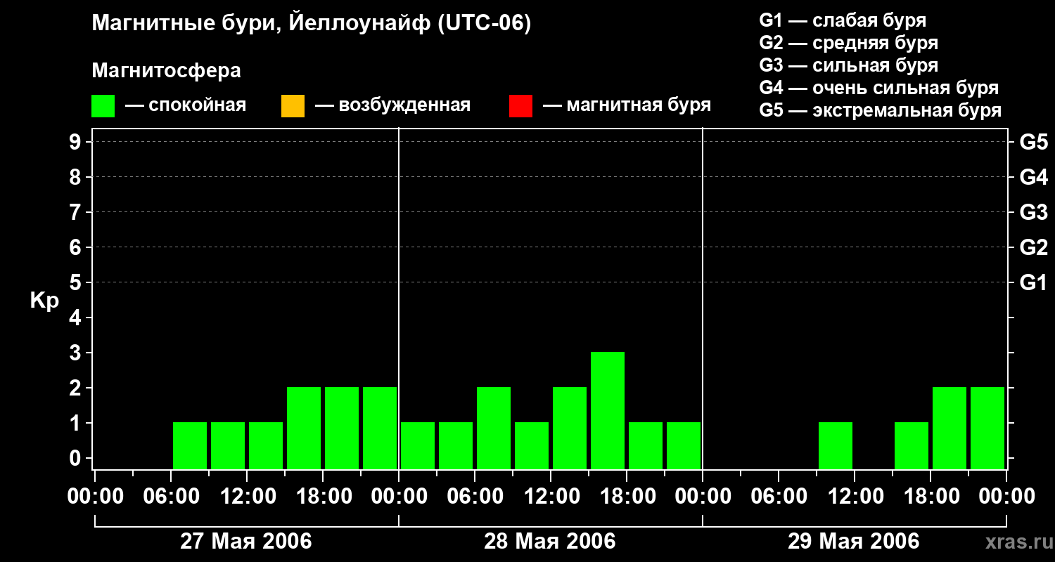 Изменения геомагнитного индекса Kp с 27 по 29 мая 2006 года для средних широт
