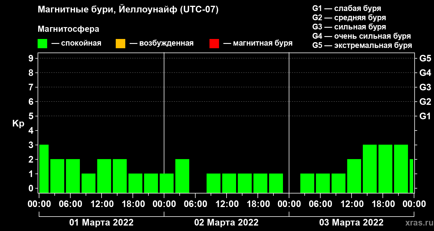 Изменения геомагнитного индекса Kp с 1 по 3 марта 2022 года для средних широт