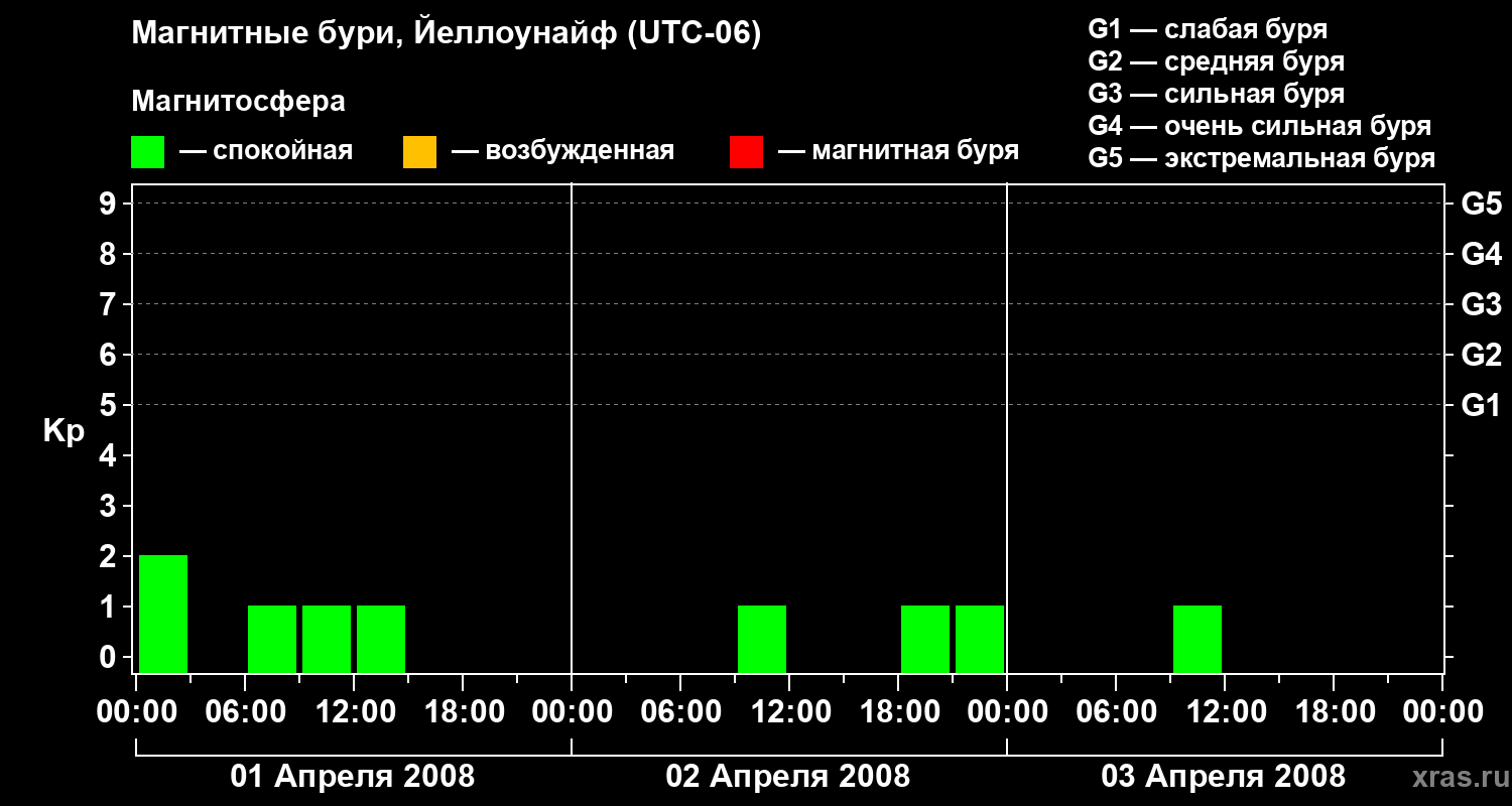 Изменения геомагнитного индекса Kp с 1 по 3 апреля 2008 года для средних широт
