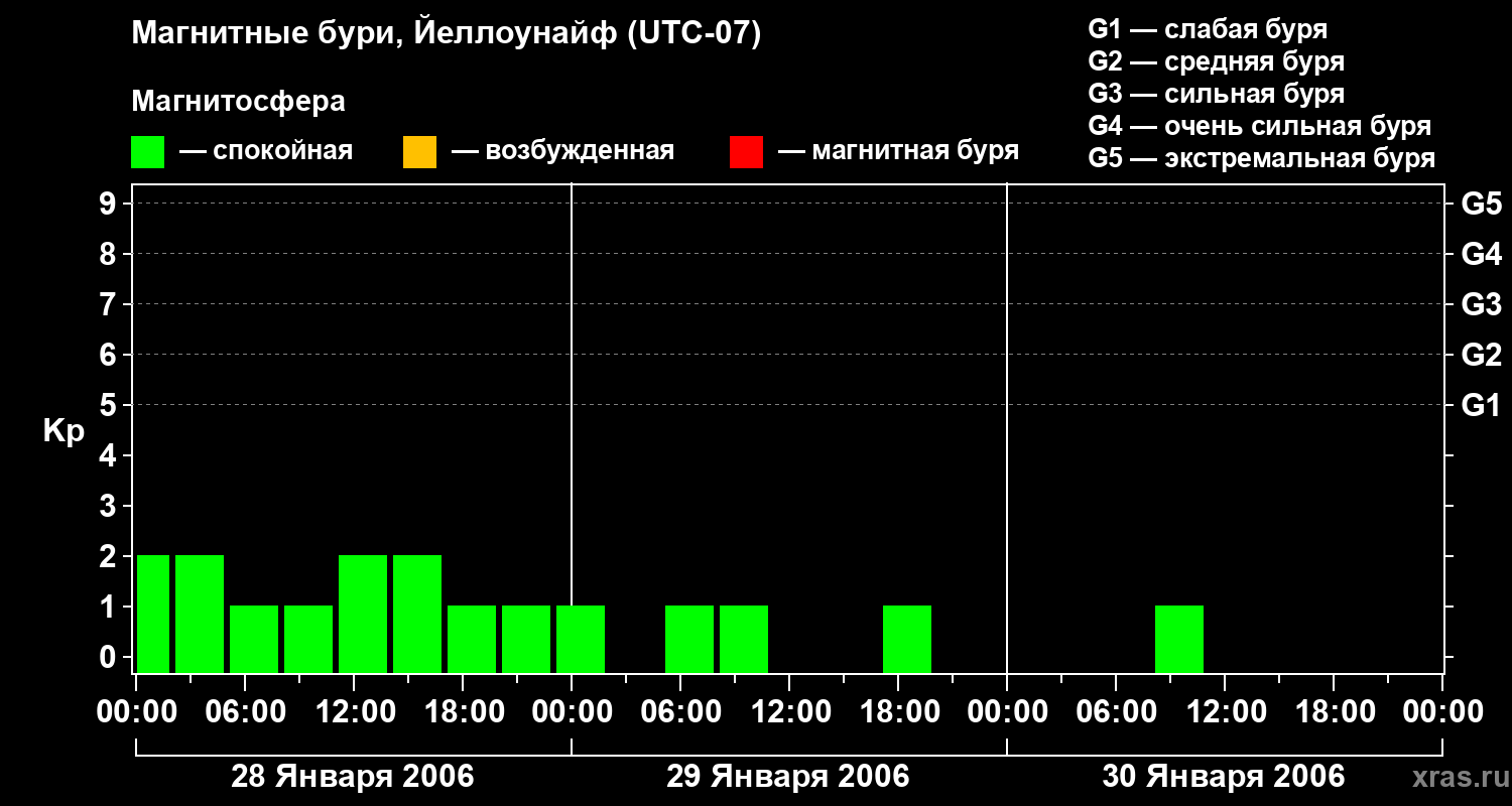 Изменения геомагнитного индекса Kp с 28 по 30 января 2006 года для средних широт