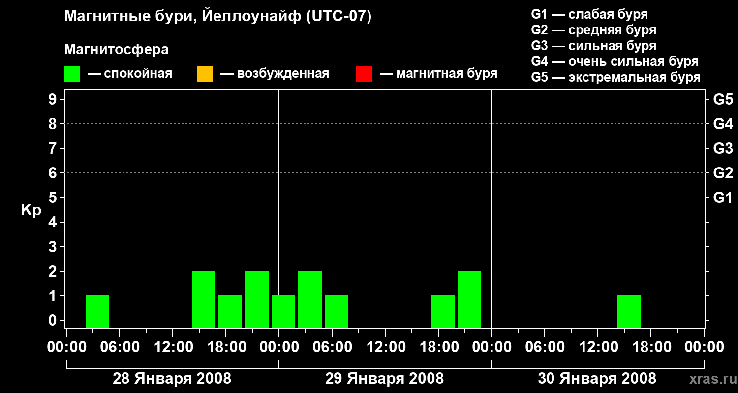 Изменения геомагнитного индекса Kp с 28 по 30 января 2008 года для средних широт