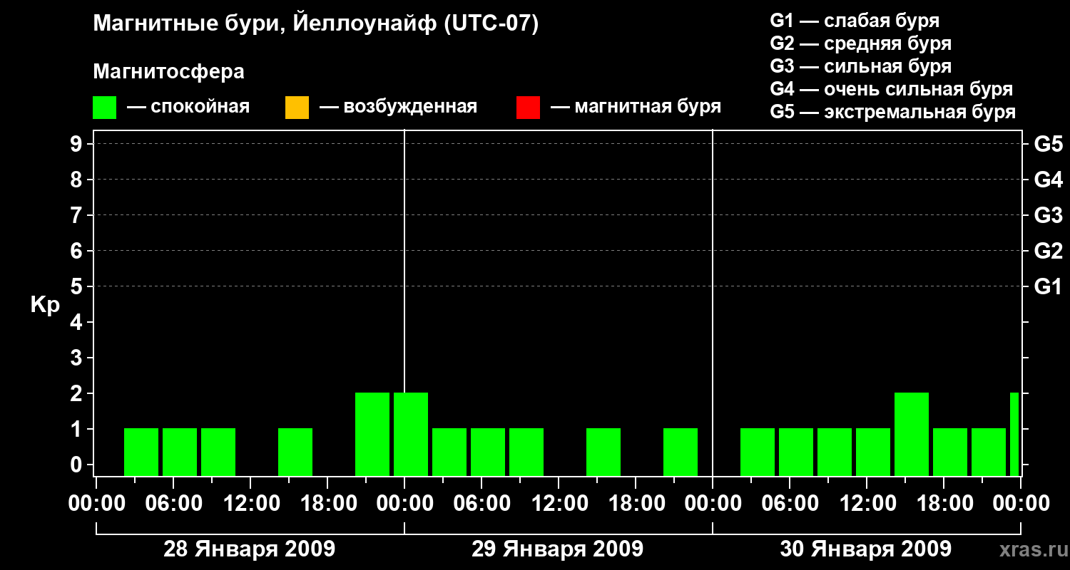 Изменения геомагнитного индекса Kp с 28 по 30 января 2009 года для средних широт