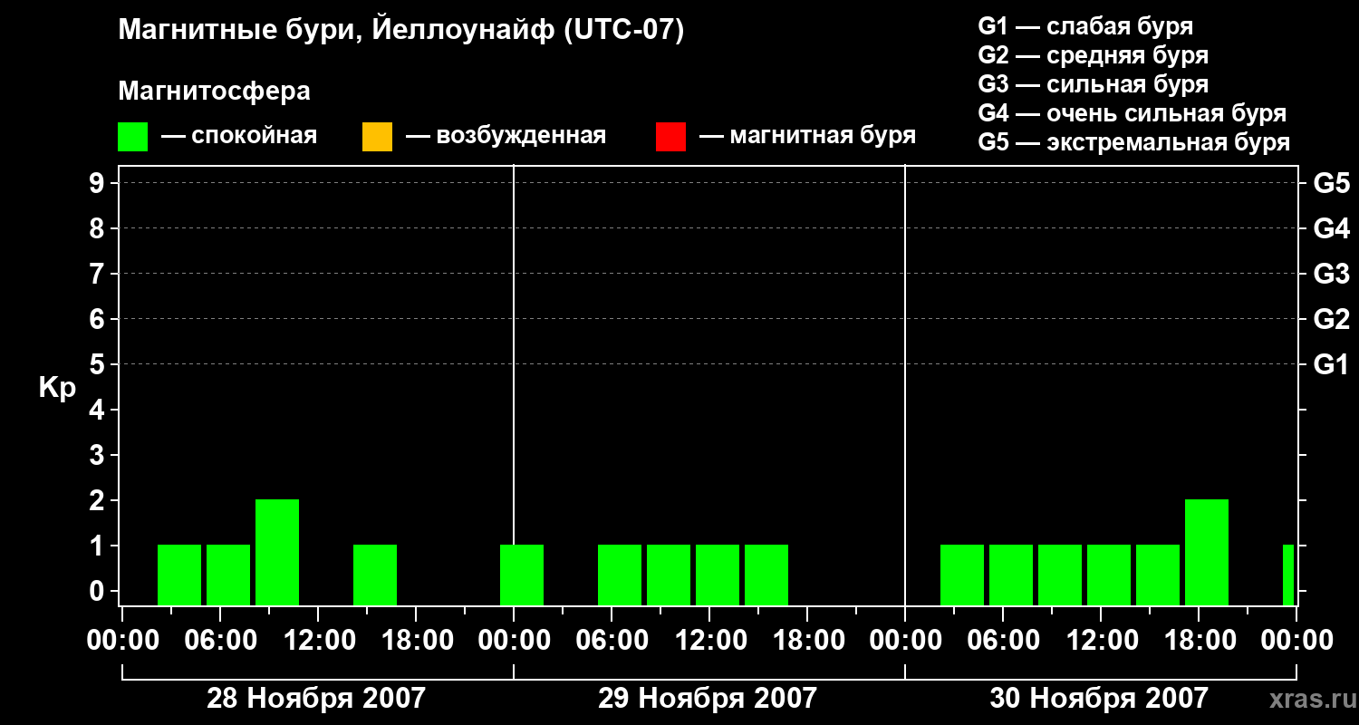 Изменения геомагнитного индекса Kp с 28 по 30 ноября 2007 года для средних широт