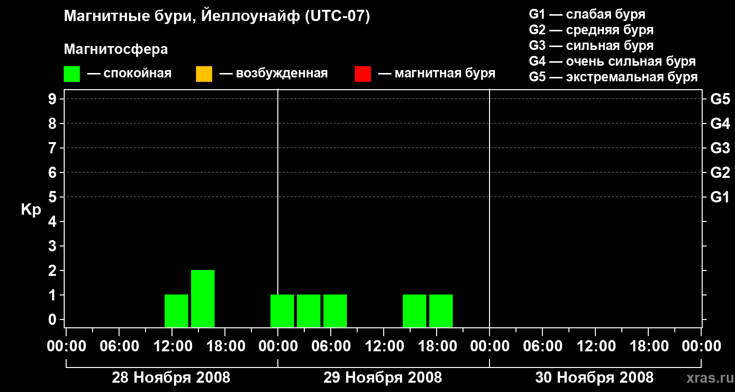 Изменения геомагнитного индекса Kp с 28 по 30 ноября 2008 года для средних широт