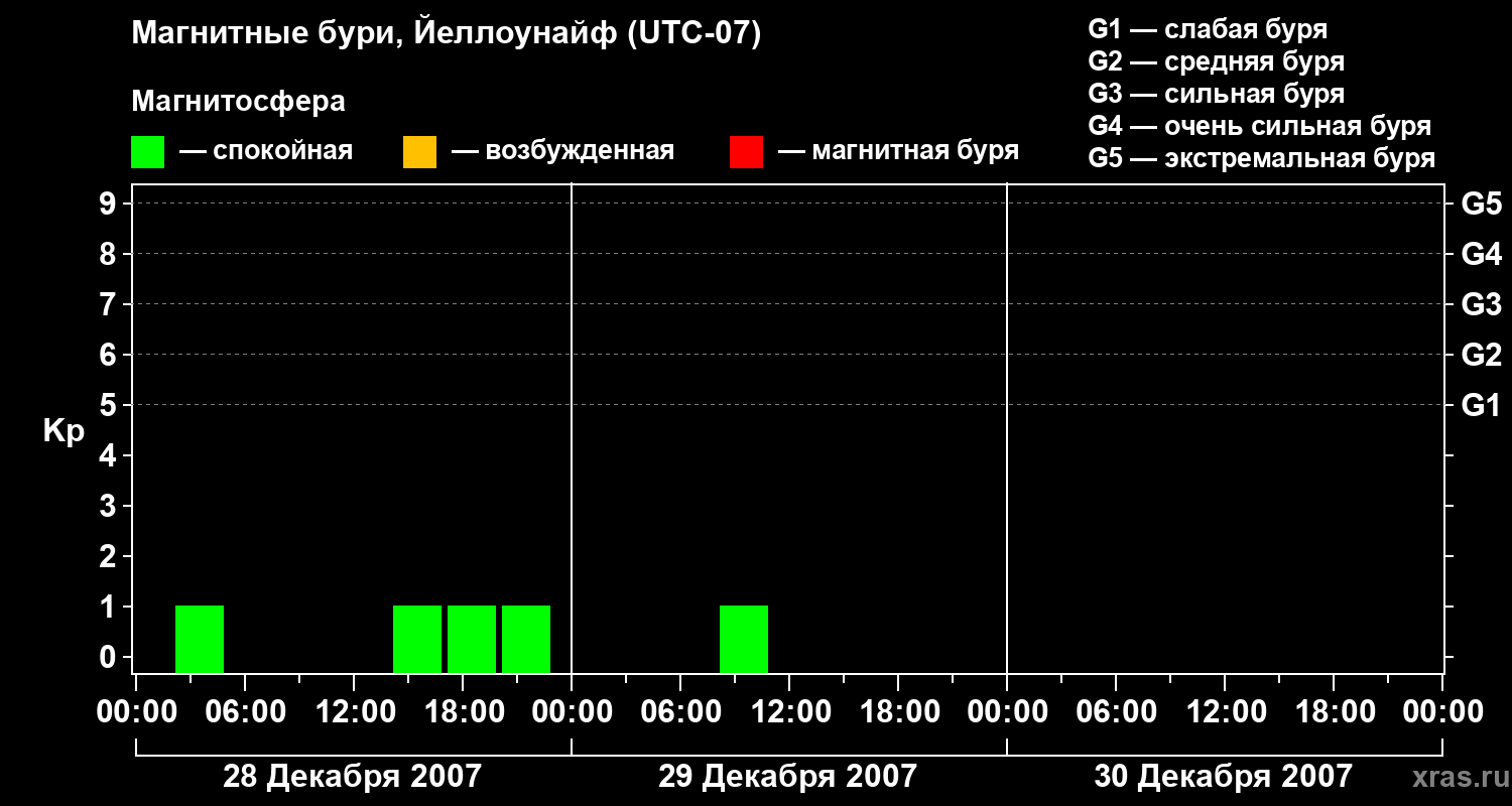 Изменения геомагнитного индекса Kp с 28 по 30 декабря 2007 года для средних широт