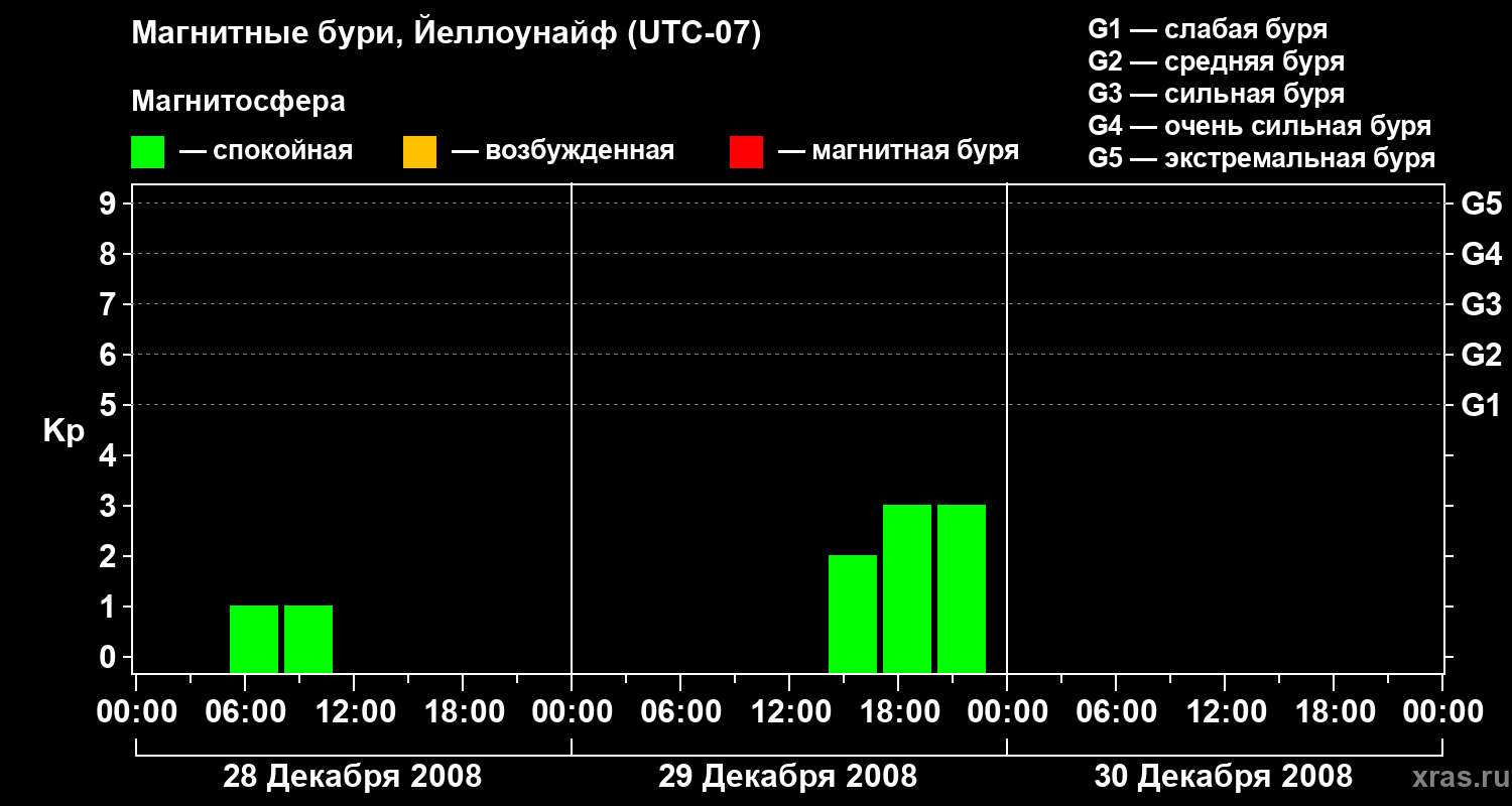 Изменения геомагнитного индекса Kp с 28 по 30 декабря 2008 года для средних широт