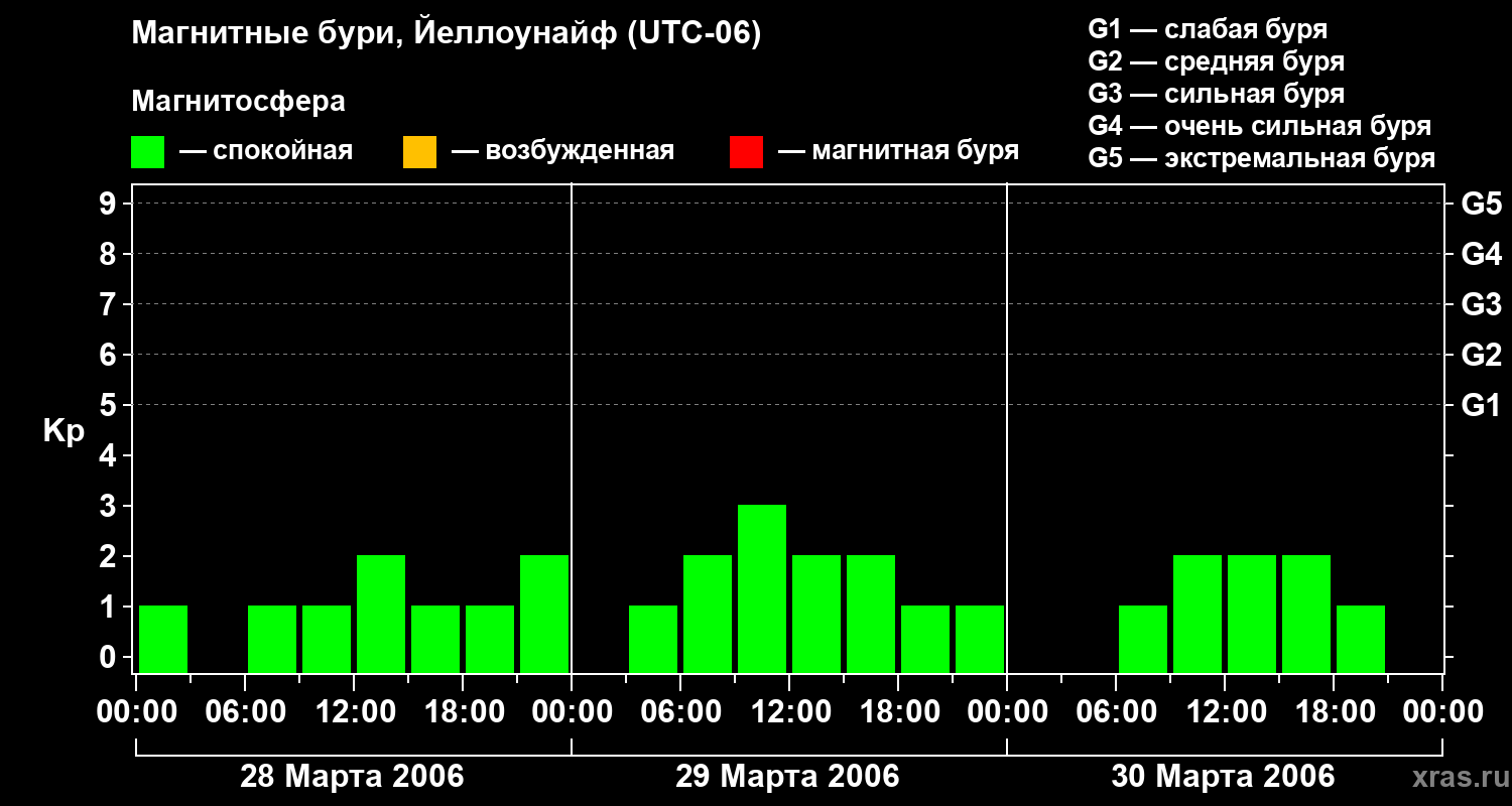 Изменения геомагнитного индекса Kp с 28 по 30 марта 2006 года для средних широт