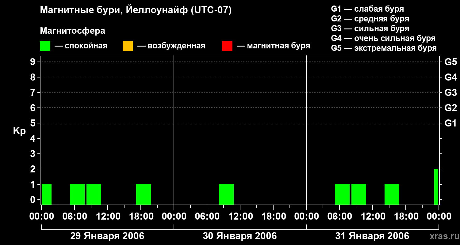 Изменения геомагнитного индекса Kp с 29 по 31 января 2006 года для средних широт