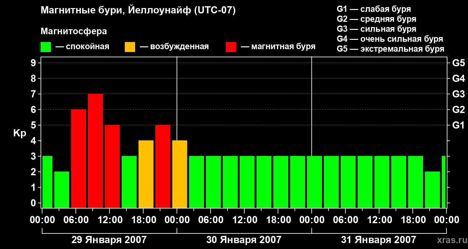 Изменения геомагнитного индекса Kp с 29 по 31 января 2007 года для средних широт