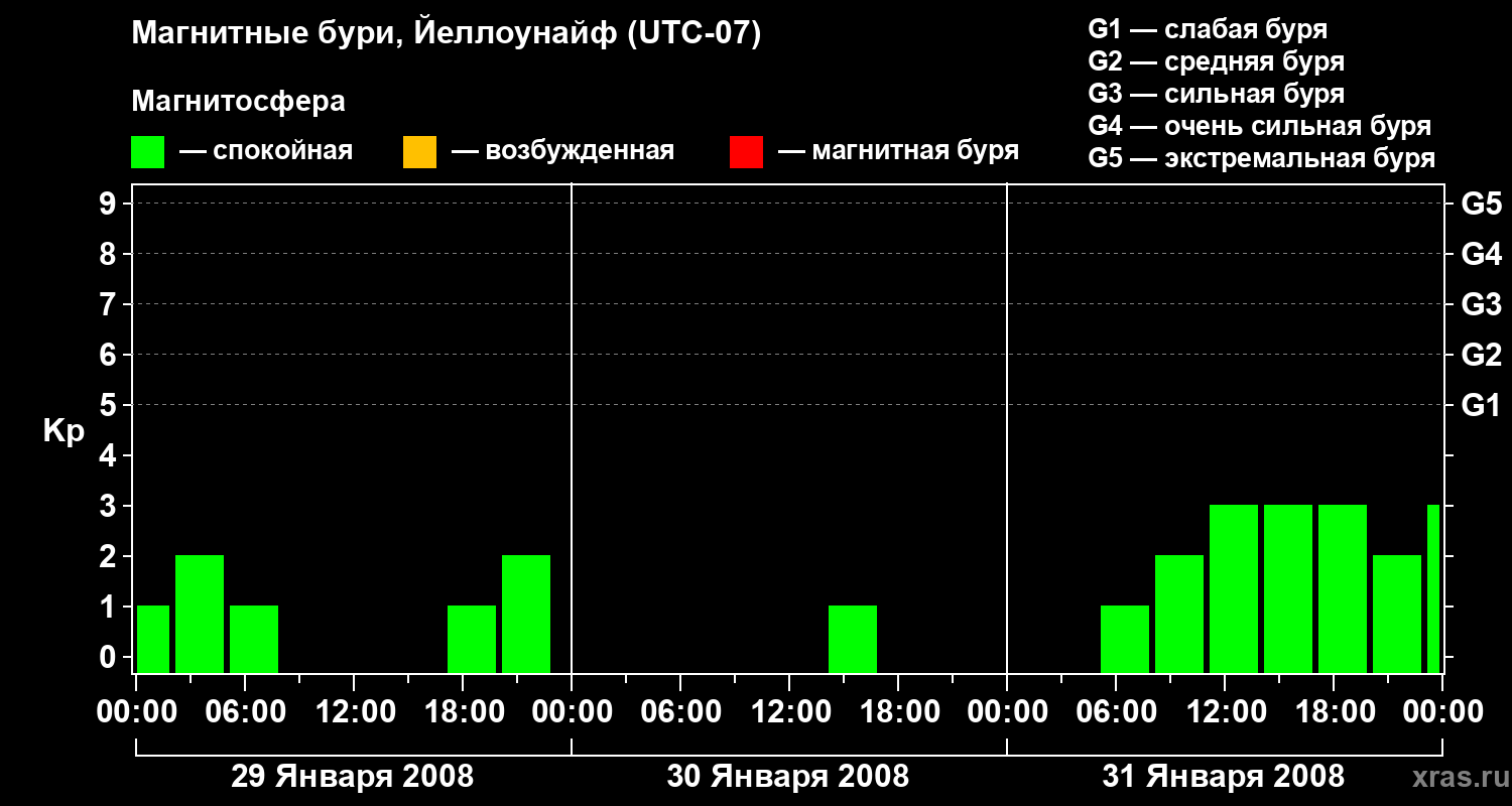 Изменения геомагнитного индекса Kp с 29 по 31 января 2008 года для средних широт