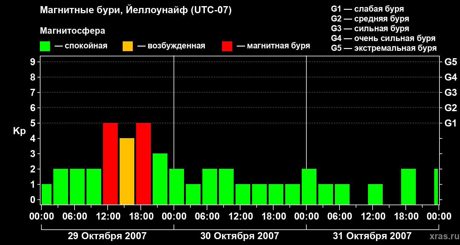 Изменения геомагнитного индекса Kp с 29 по 31 октября 2007 года для средних широт