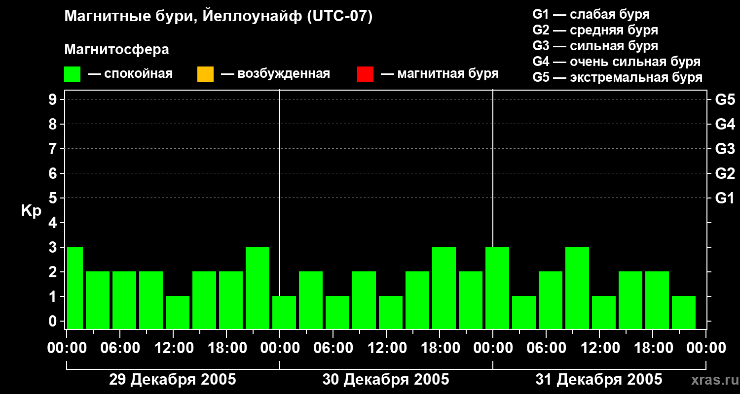 Изменения геомагнитного индекса Kp с 29 по 31 декабря 2005 года для средних широт