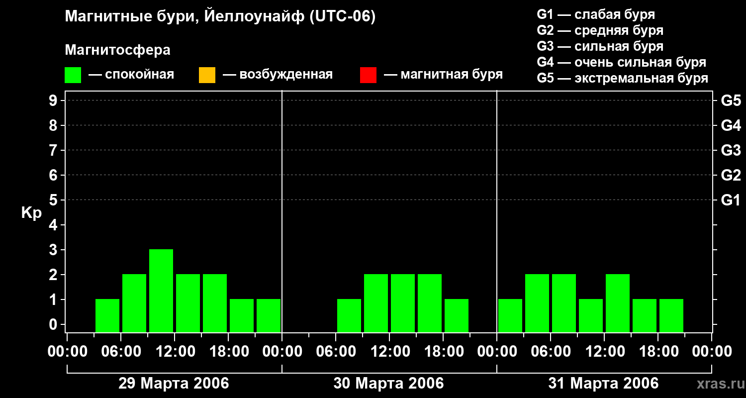 Изменения геомагнитного индекса Kp с 29 по 31 марта 2006 года для средних широт