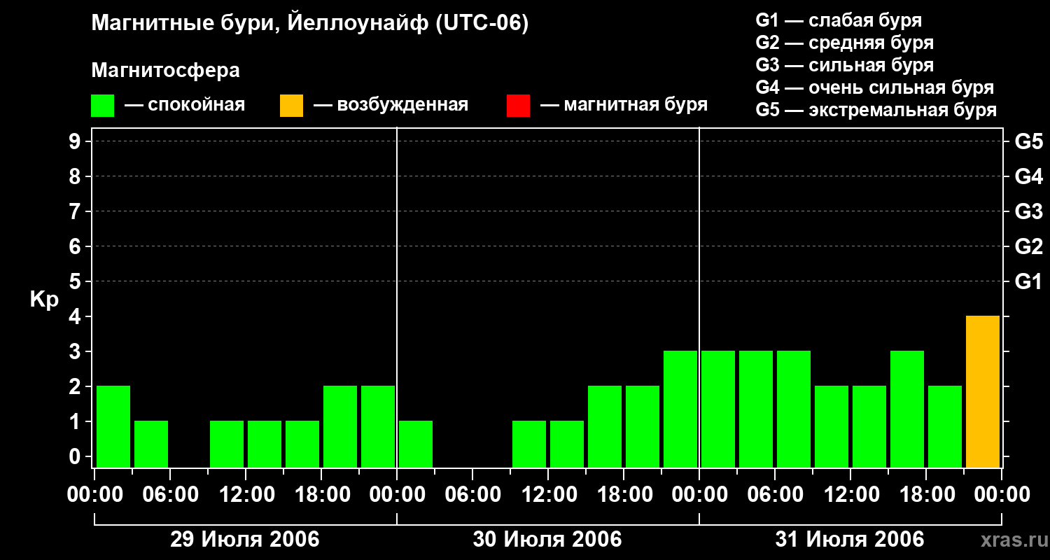 Изменения геомагнитного индекса Kp с 29 по 31 июля 2006 года для средних широт