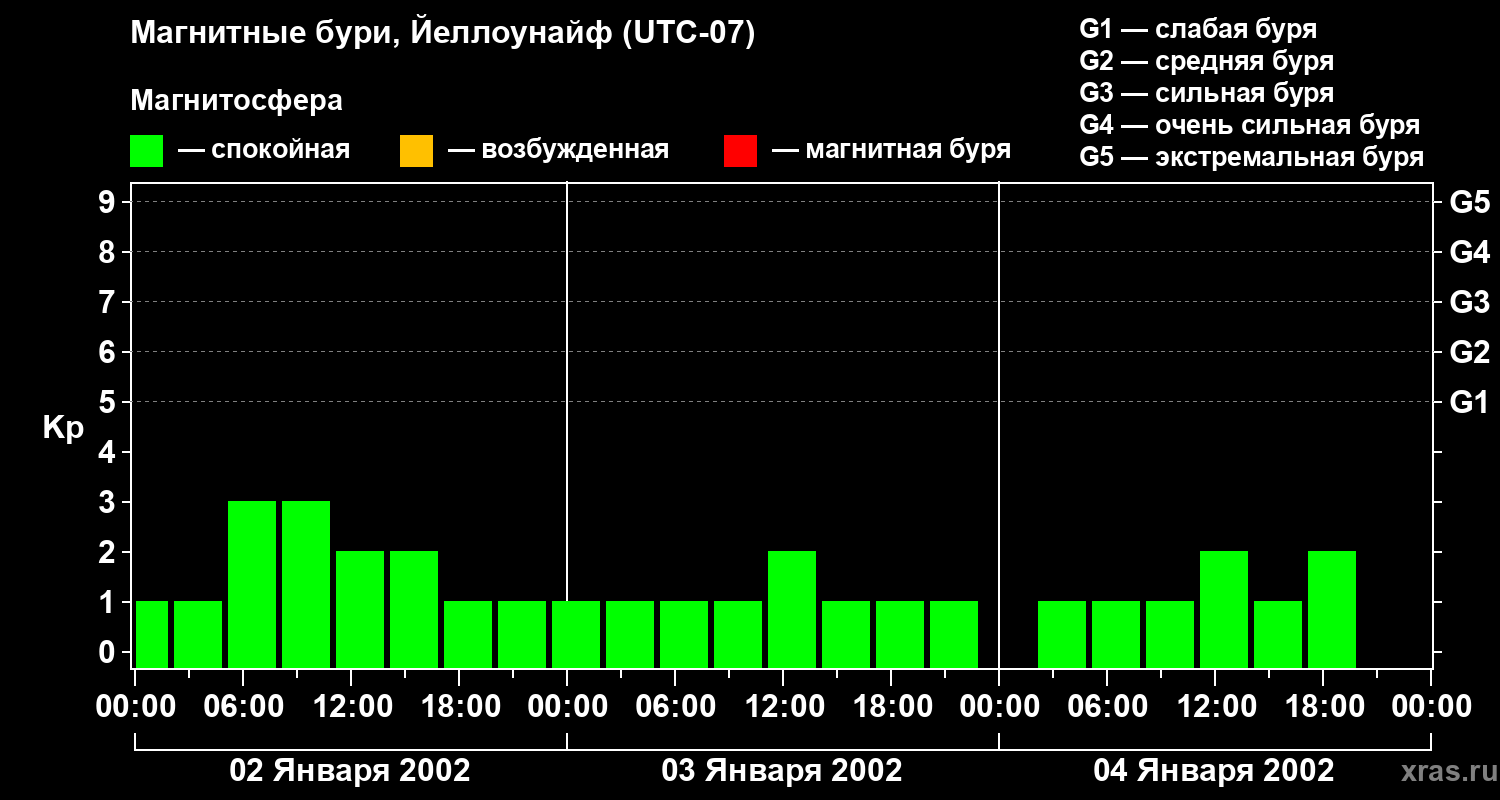 Изменения геомагнитного индекса Kp с 2 по 4 января 2002 года для средних широт