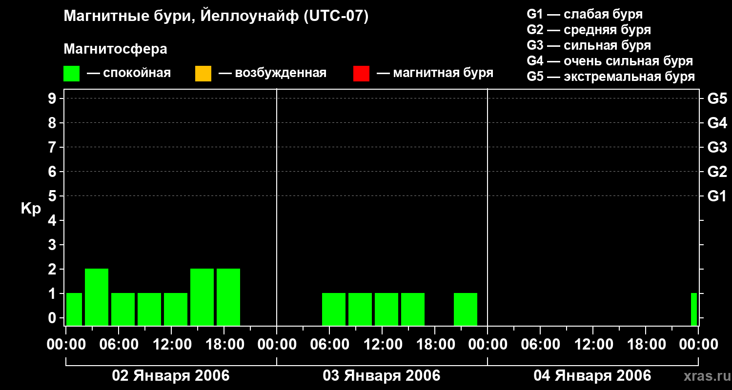 Изменения геомагнитного индекса Kp с 2 по 4 января 2006 года для средних широт