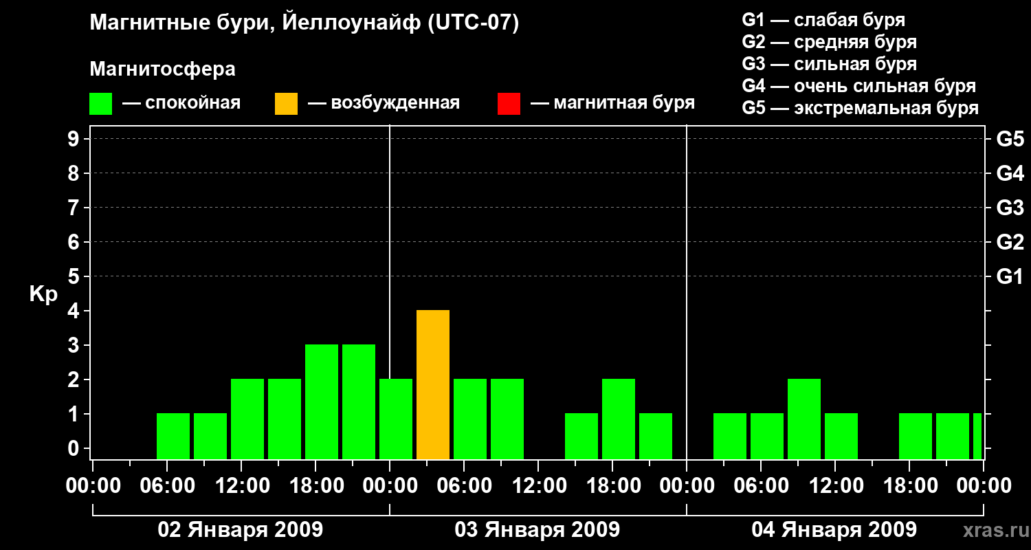 Изменения геомагнитного индекса Kp с 2 по 4 января 2009 года для средних широт