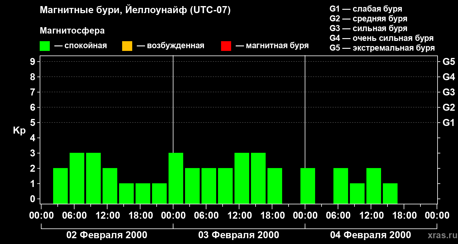 Изменения геомагнитного индекса Kp с 2 по 4 февраля 2000 года для средних широт