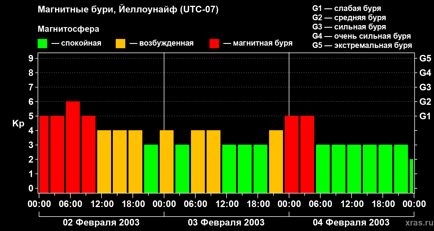 Изменения геомагнитного индекса Kp с 2 по 4 февраля 2003 года для средних широт