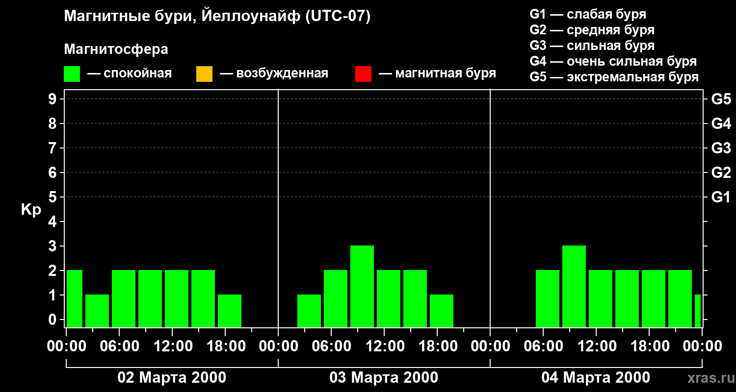 Изменения геомагнитного индекса Kp с 2 по 4 марта 2000 года для средних широт