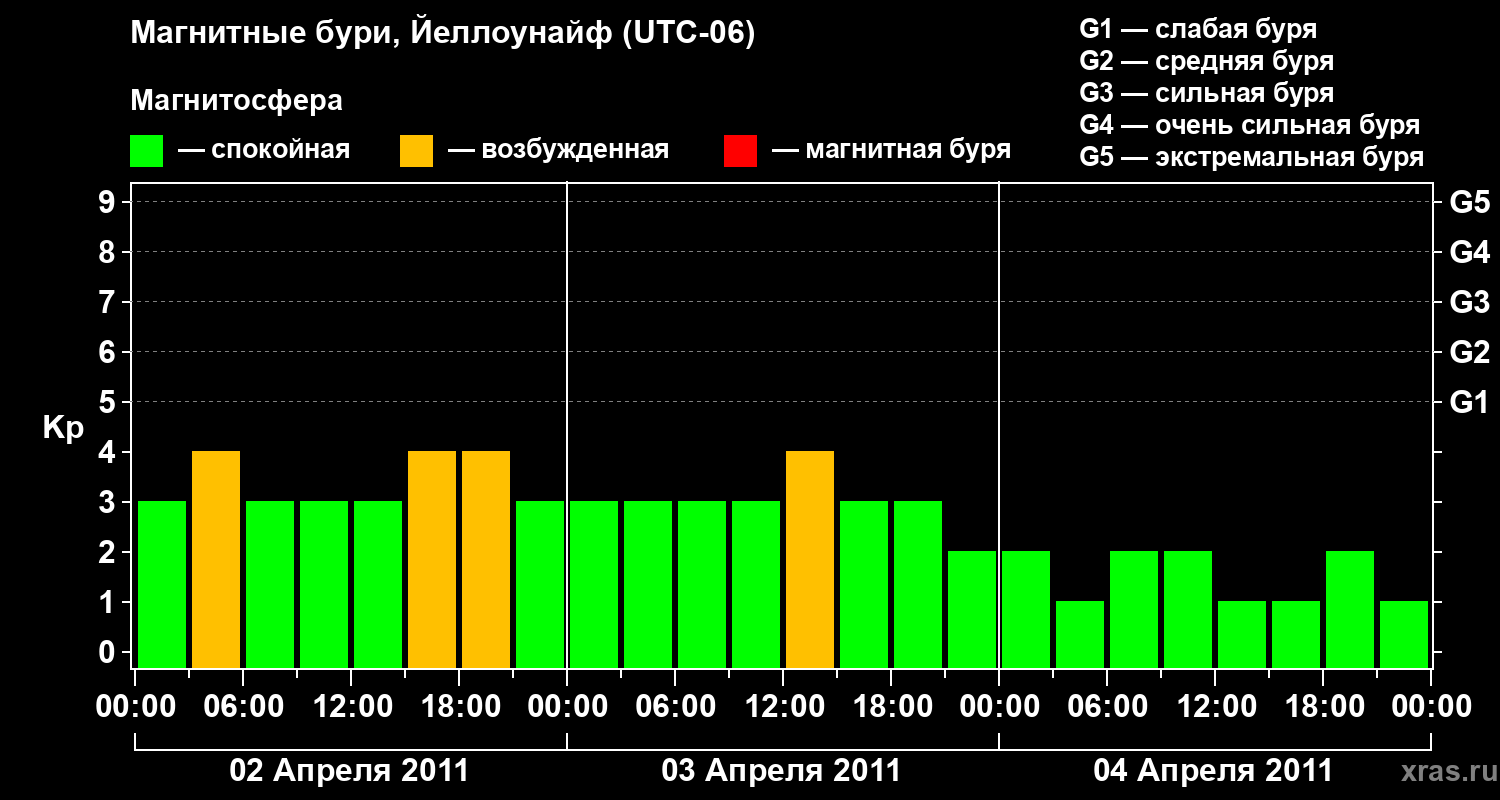 Изменения геомагнитного индекса Kp с 2 по 4 апреля 2011 года для средних широт