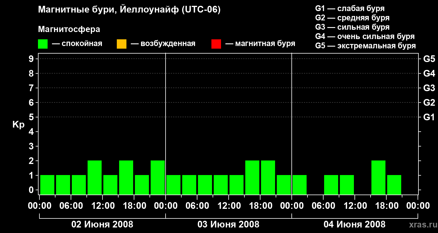 Изменения геомагнитного индекса Kp с 2 по 4 июня 2008 года для средних широт