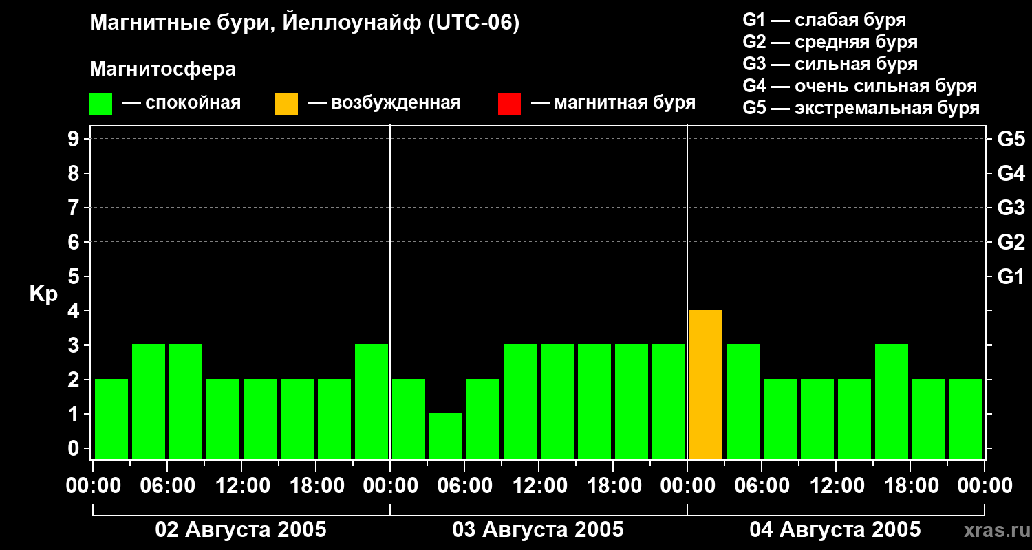 Изменения геомагнитного индекса Kp с 2 по 4 августа 2005 года для средних широт