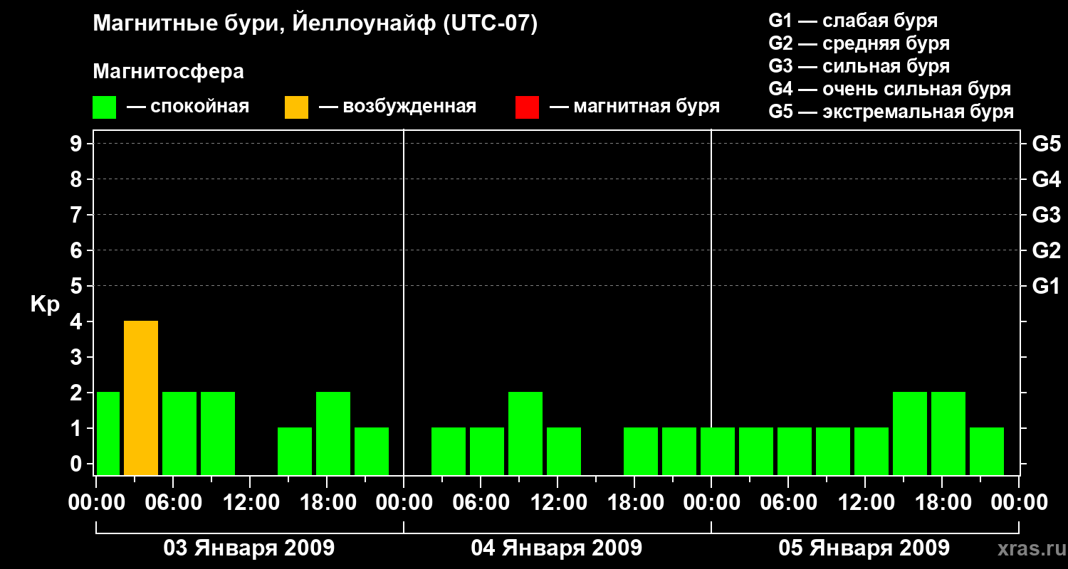 Изменения геомагнитного индекса Kp с 3 по 5 января 2009 года для средних широт