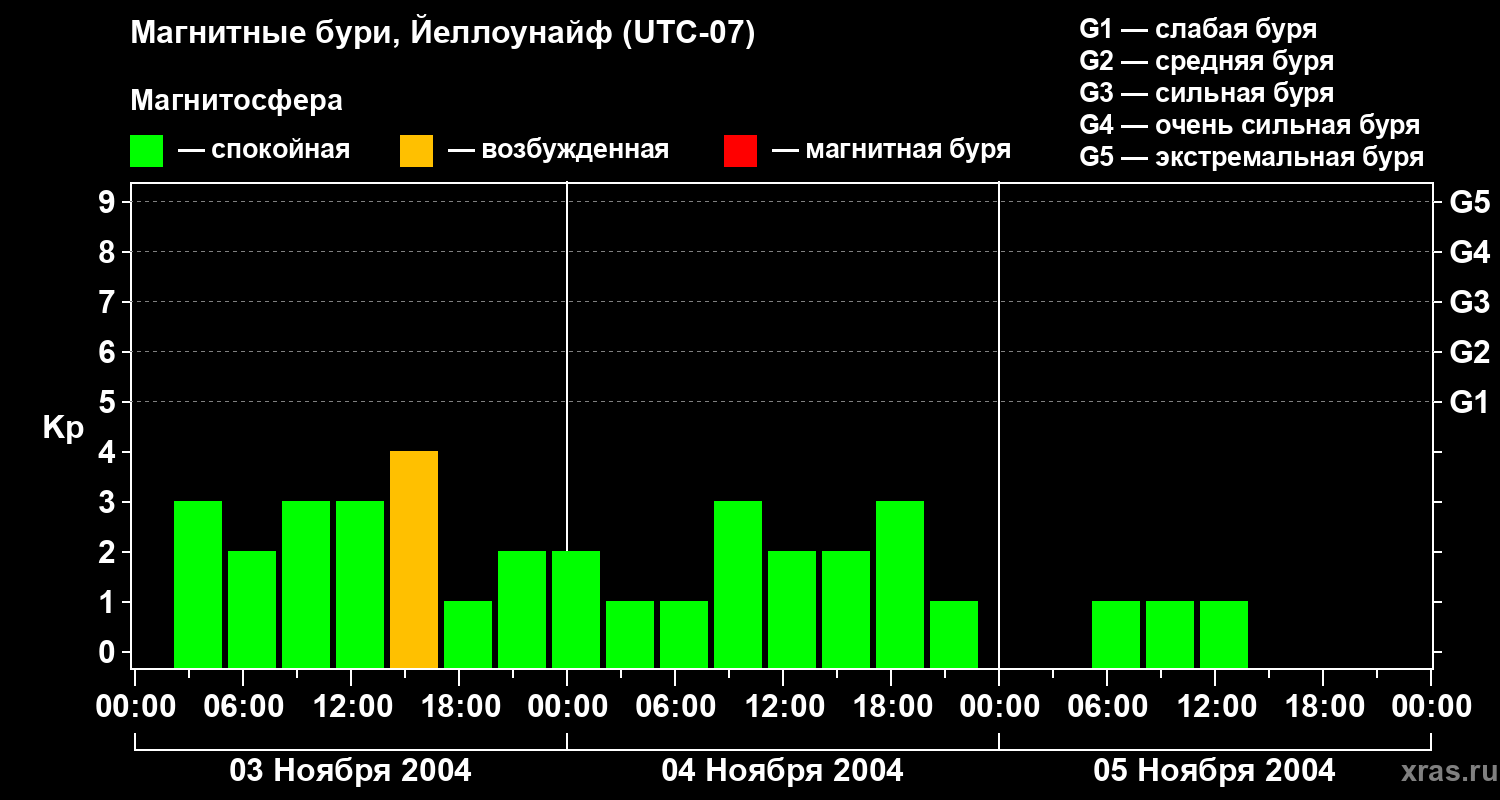 Изменения геомагнитного индекса Kp с 3 по 5 ноября 2004 года для средних широт
