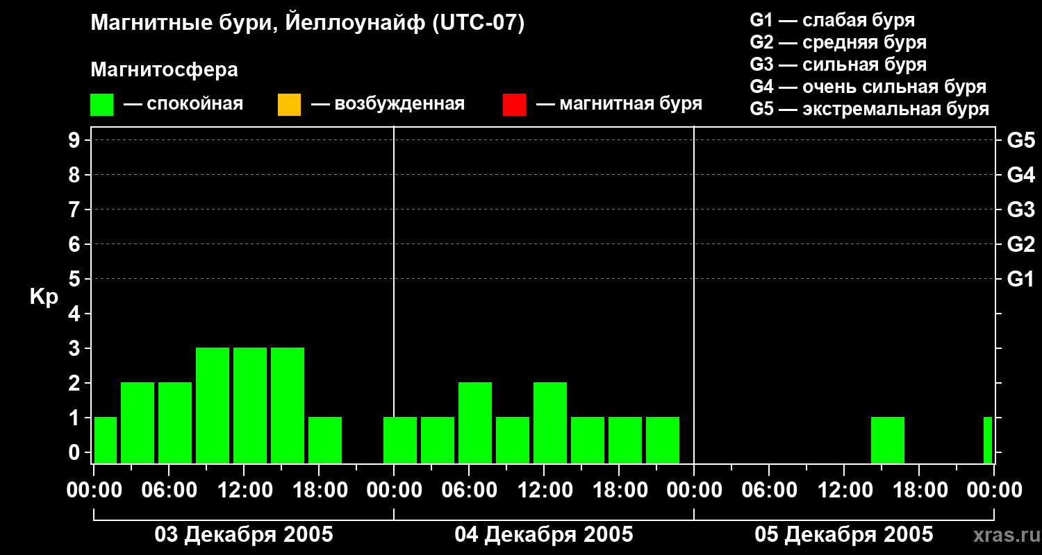 Изменения геомагнитного индекса Kp с 3 по 5 декабря 2005 года для средних широт
