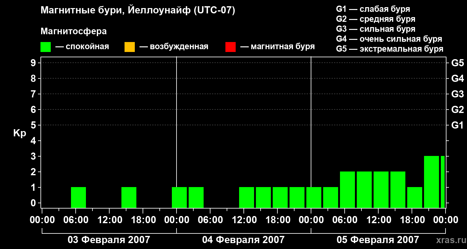 Изменения геомагнитного индекса Kp с 3 по 5 февраля 2007 года для средних широт