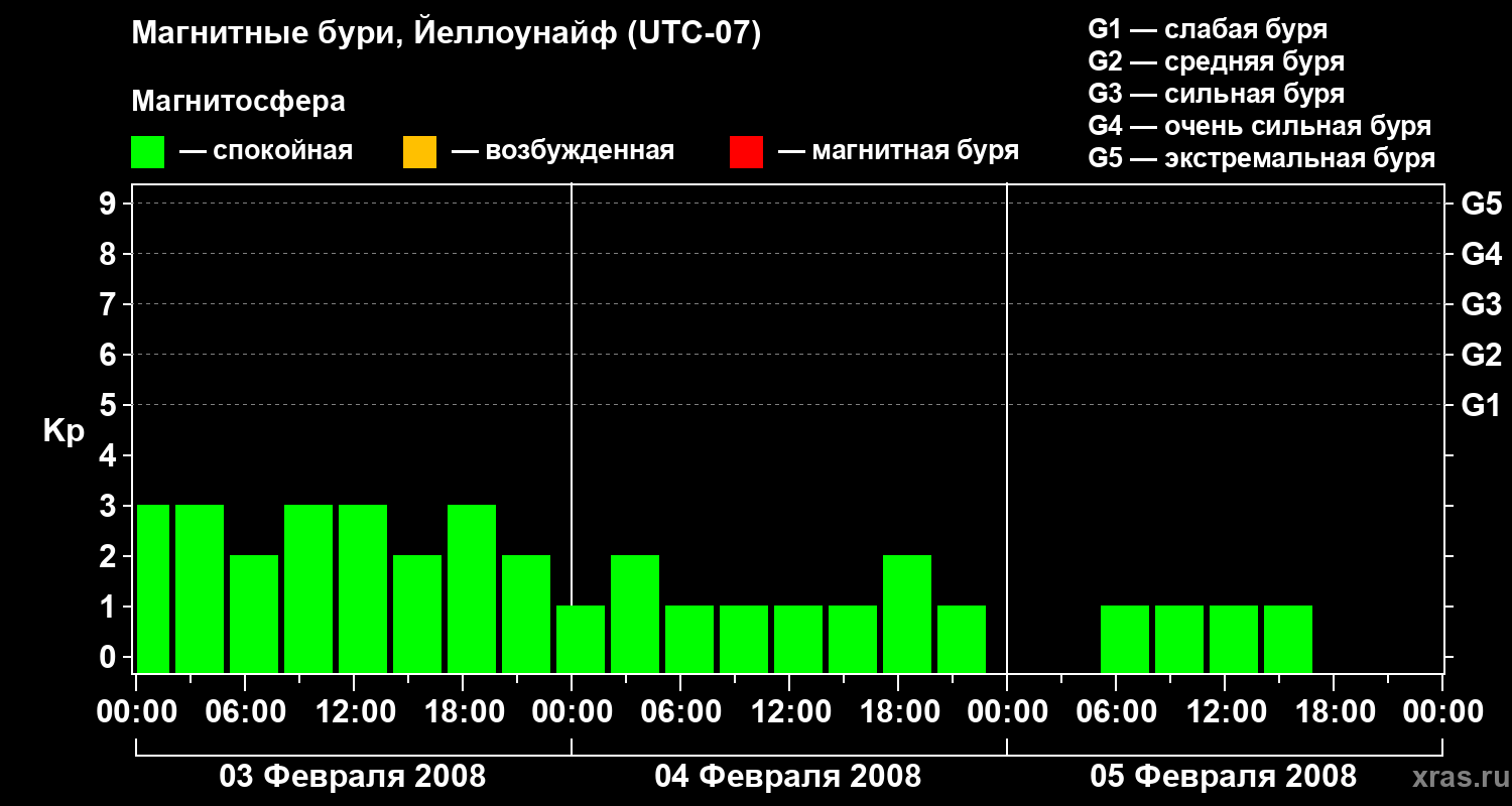 Изменения геомагнитного индекса Kp с 3 по 5 февраля 2008 года для средних широт