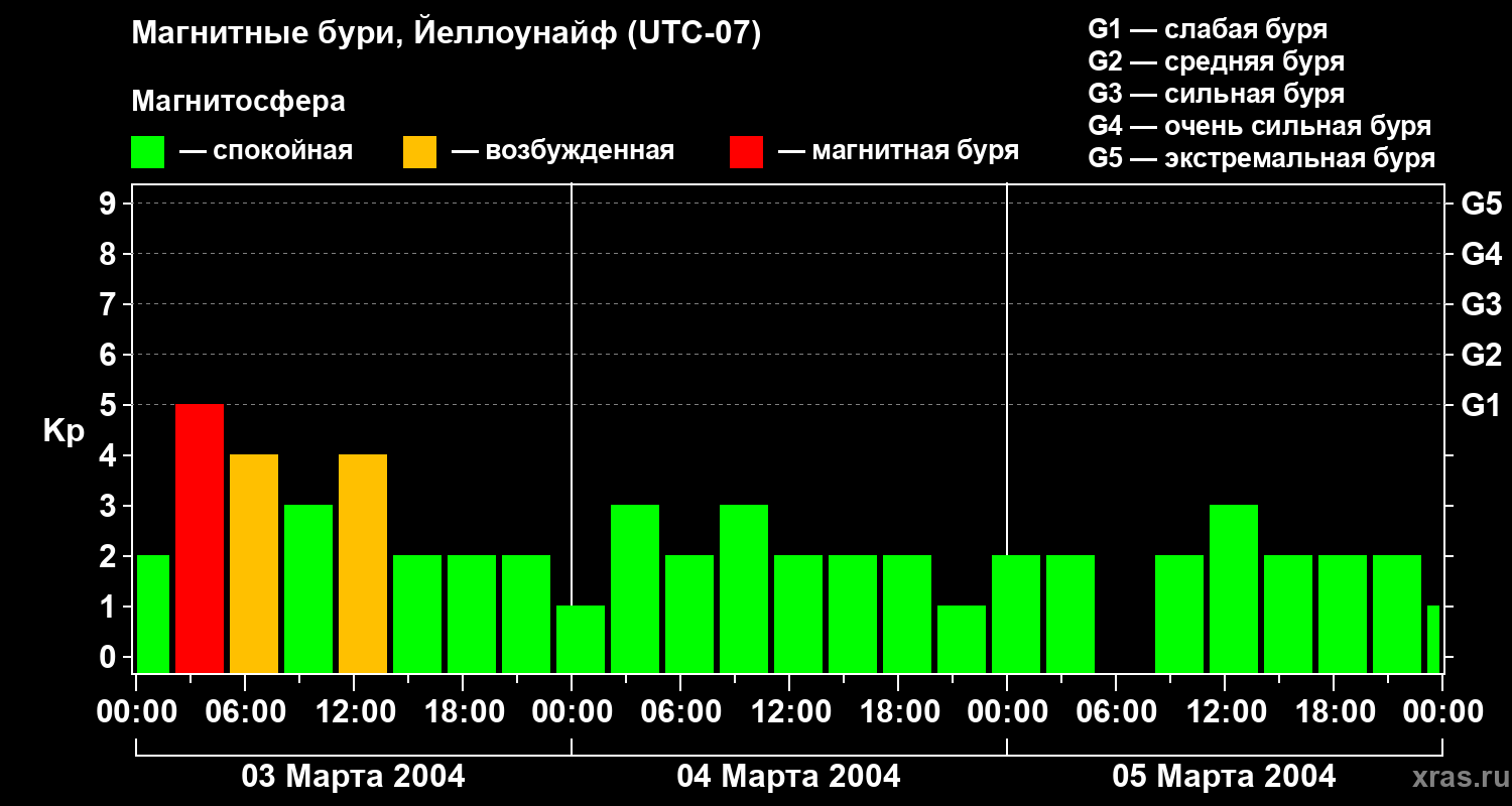 Изменения геомагнитного индекса Kp с 3 по 5 марта 2004 года для средних широт